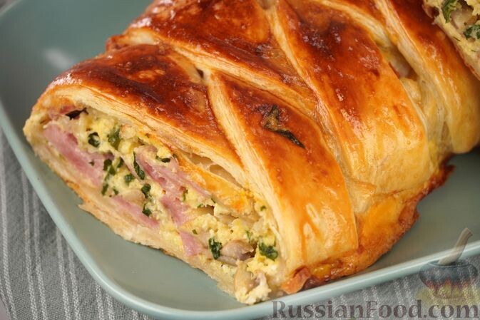 - Слоёный пирог с грибами. Нежные яйца, обжаренные шампиньоны и ветчина делают эту выпечку особенно насыщенной и аппетитной. Пирог станет настоящей звездой вашего застолья.