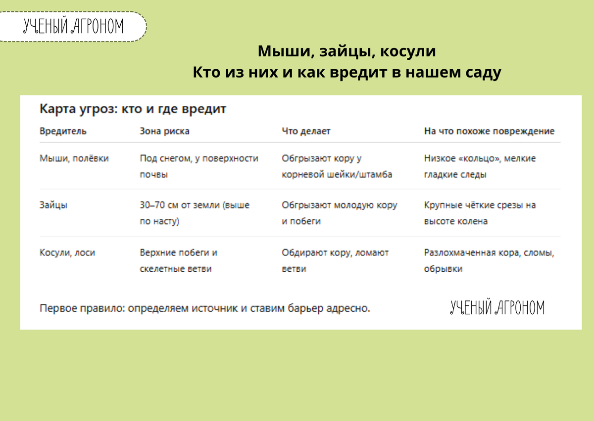 В холодное время года многие садоводы сталкиваются с проблемами, вызванными недостатком корма. Под слоем снега прячутся грызуны, готовые навредить корнешьям деревьев, а зайцы, используя снежный покров, добираются до коры на высоте до семидесяти сантиметров. Косули и лоси также наносят ущерб, ломая ветви в поисках пищи. Неправильная защита может привести к гибели молодых деревьев всего за одну ночь.