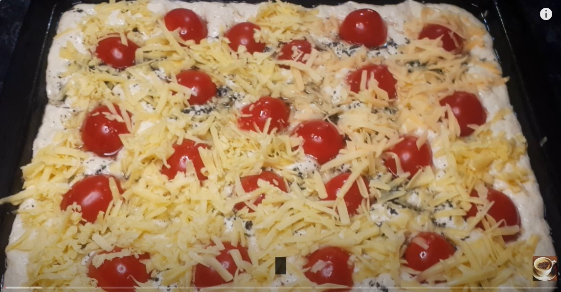 Тем временем можно приготовить ароматное масло, подогрев оливковое с добавлением сушеных трав. Обычно в это время натирают сыр и нарезают помидоры черри. Когда тесто подходит, его необходимо вдавить пальцами, чтобы сделать характерные углубления. В эти ямки вливается ароматное масло, сверху выкладываются помидоры и сыр.