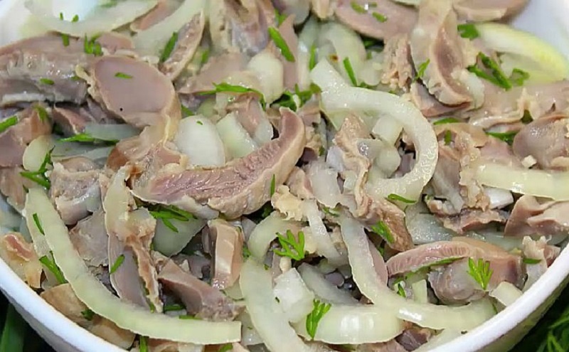 После варки желудочки нарезаются мелко и соединяются с маринованным луком, щедро посыпаются укропом и перемешиваются с добавлением уксуса. Чем дольше салат настаивается, тем ярче раскрывается его вкус.