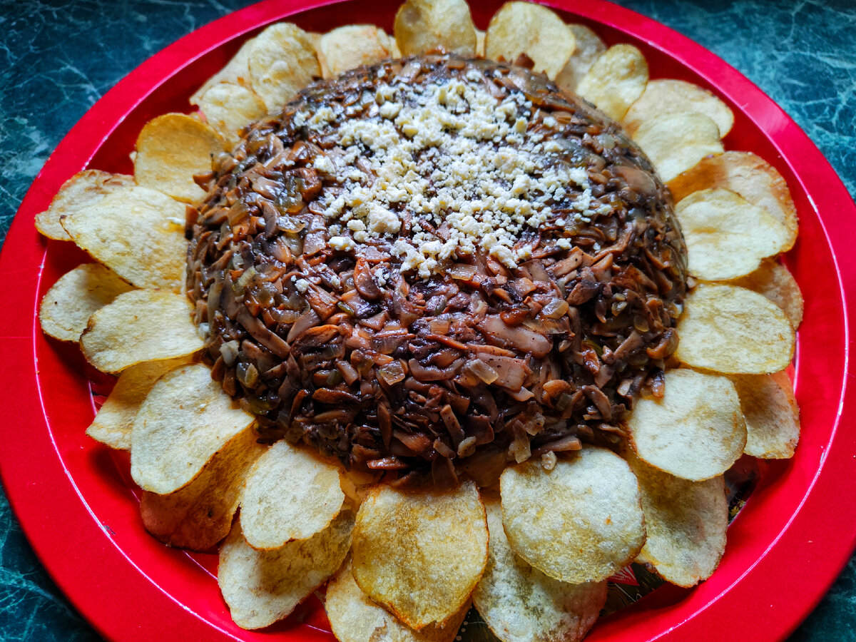 Когда будете готовы подавать, аккуратно переверните салат на плоскую тарелку и украсьте чипсами, обладающими вкусом грибов, и отложенным желтком, сообщает источник.