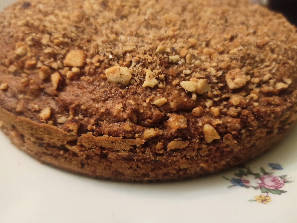 Форму для выпекания необходимо смазать маслом и присыпать мукой (или использовать бумагу для выпечки, если это силиконовая форма). На дно выложить немного ореховой крошки, затем половину теста, снова слой крошки и оставшееся тесто, завершив своеобразный "слоеный" пирог остатками крошки сверху.