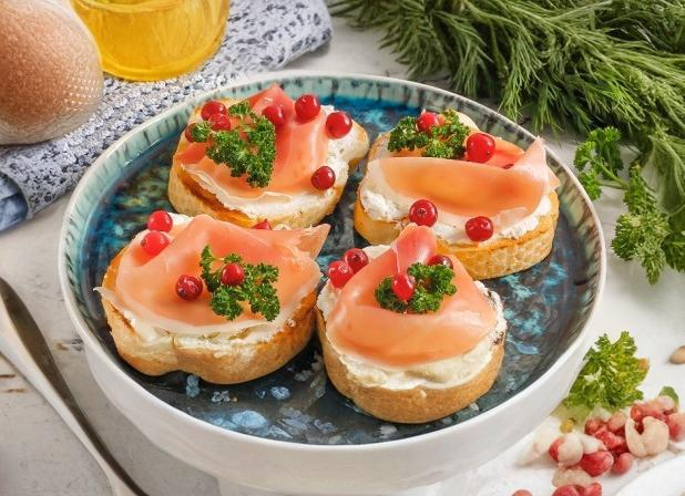 4. На мазанные сырым ломтики выложите вяленый бекон или другой подходящий мясной деликатес. Можно добавить промытые ягоды клюквы — они привнесут в блюдо кислинку, которая прекрасно дополнит вкус?ных ингредиентов.