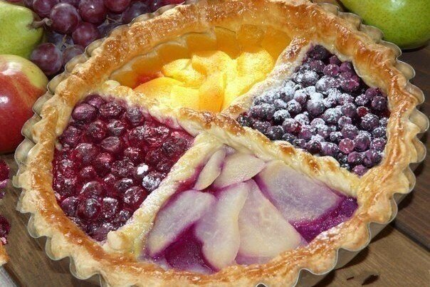 Сначала необходимо разморозить тесто, при этом две полоски оставить для формирования вертикальных бортиков. Остальную часть теста аккуратно раскатать и выложить в смазанную растительным маслом форму, создав бортики для начинки.Полученные карманы для начинки заполнить ягодами и фруктами. Если ягоды заморожены, стоит добавить немного крахмала, чтобы избежать выделения сока. Груши и персики можно притрусить сахаром. Не забудьте смазать верхнюю часть теста яичным желтком для более румяной корочки.Отправить пирог в предварительно разогретую до 180 градусов духовку и выпекать около 25 минут. Подавать, посыпав сахарной пудрой для дополнительной сладости и красоты.