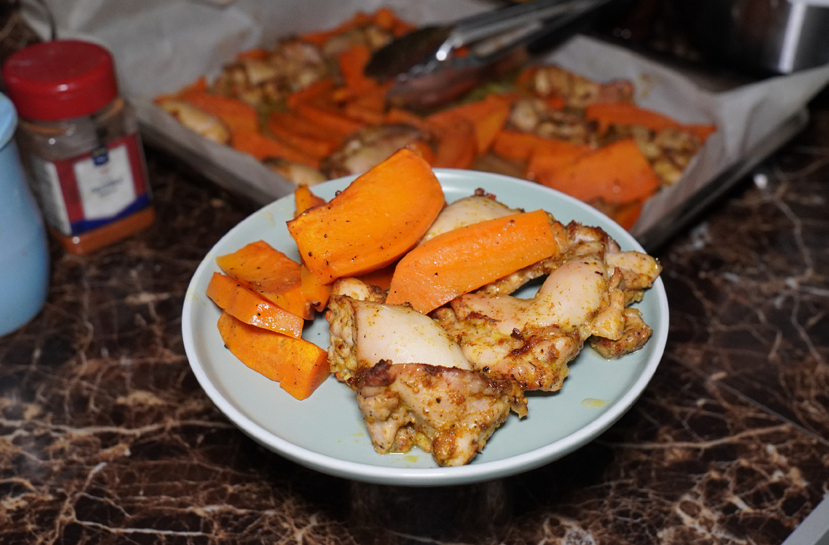 И вот, готово! Сочетание запеченного батата и куриных бедер радует глаз и вкус. Приятного аппетита!