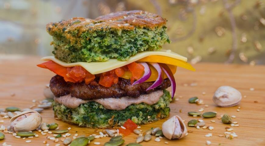 Яркий, необычный и невероятно аппетитный вау-бургер с зелёным бисквитом-булочкой, пряной говяжьей котлетой и насыщенным орехово-медовым соусом не оставит равнодушным даже самых привередливых гурманов.