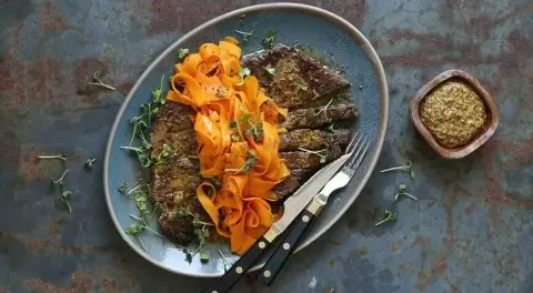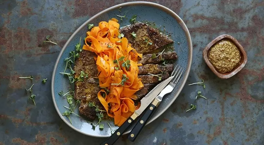 Это блюдо придется по вкусу не только мужчинам, но и женщинам, которые ценят оригинальные кулинарные решения. Главным героем вечера станет мясо, а морковная паста прекрасно дополнит стейк, придавая ему особую изюминку.
