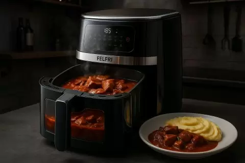 Готовый гуляш в аэрогриле обретает характерный кирпично?красный оттенок и чистый аромат паприки, оставаясь при этом сочным и без лишнего жира. Всё в одной форме — меньше грязной посуды и больше времени на семью.