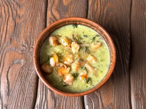 - Приготовление: На разогретой сковороде обжариваются лук, чеснок и розмарин. Следом добавляется пшено и жарится ещё немного. Вливается горячий бульон, после чего готовится до состояния готовности. Креветки обжариваются на отдельной сковороде, добавляется соус бешамель и песто. И в конце — финальная подача на тарелках.
