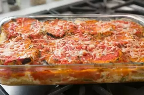 Эта традиционная итальянская слоеная запеканка напоминает лазанью, но вместо пасты используется насыщенный вкус панированных баклажанов, щедро приправленных ароматами пармезана, моцареллы и свежего базилика, а также легким томатным соусом.