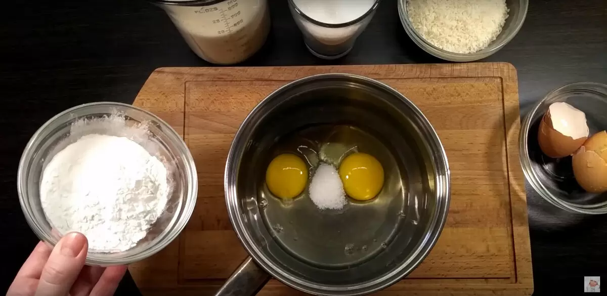 Чтобы начать процесс, следует взять кастрюлю и вбить в неё два яйца. К ним добавляют пакетик ванильного сахара, две столовые ложки кукурузного крахмала и 200 граммов сахара. Постепенно вводя 500 мл молока, важно тщательно перемешивать венчиком, чтобы избежать комков. Ставим кастрюлю на средний огонь: как только станет заметна пара, убавляем до маленького и продолжаем помешивать, дожидаясь загустения крема.