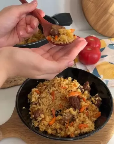 Все ингредиенты заливают водой и оставляют томиться на 40 минут. На последнем этапе добавляют рис и немного жидкости, оставляя готовиться еще на полчаса. В результате получается рассыпчатый рис, нежное мясо и ароматные овощи — идеальное сочетание для настоящего узбекского плова.