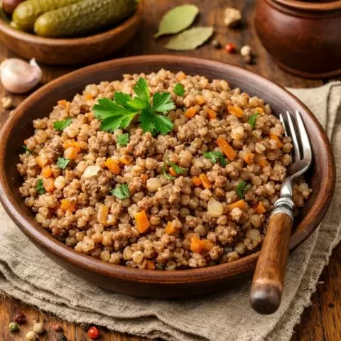 Гречка в этом блюде — не просто гарнир. Это уютный, сытный фундамент, который впитывает в себя ароматы мяса и овощей. Фарш, приготовленный с луком, морковью и томатом, — это не просто еда, а настоящая награда. Гречка по-купечески проста, понятна и, главное, уверена в своей правоте. Она дарит тепло и уют, ассоциируется с домашним confort, и потому после долгого дня вызывает особое довольство.