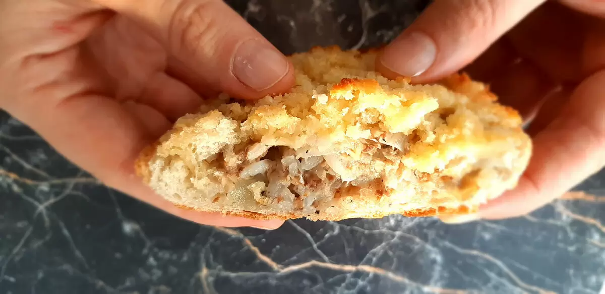 Теперь начинка готова: к ней необходимо добавить консервированную рыбу и обжаренный лук. По желанию можно не добавлять соль, если консервированная рыба уже достаточно соленая.