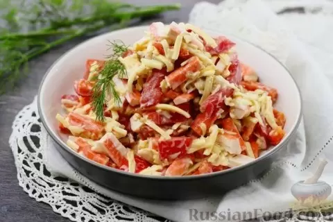 Крабовый салат с овощами, сыром и грецкими орехами – это идеальное сочетание. Нежные крабовые палочки прекрасно сочетаются с сочными помидорами, цветным болгарским перцем и хрустящими орехами. Блюдо готовится быстро и станет отличным вариантом для гостей или перекуса.