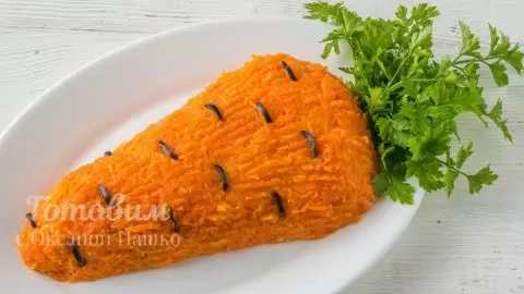 7. Сверху выложите тертые огурцы и обмажьте их майонезом. Завершайте, укрыв салат тертой морковью, формируя красивую вершину, как у настоящей морковки.