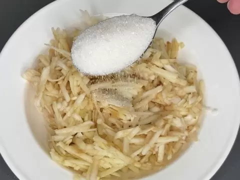 Начинаем с фруктов: яблоки очищаем и натираем на крупной терке. Чтобы они не потемнели, можно слегка сбрызнуть соком лимона, однако это не критично — яблоки все равно насыщены вкусом. Затем добавляем 1 столовую ложку сахара и оставляем в сторону, чтобы выделился сок.