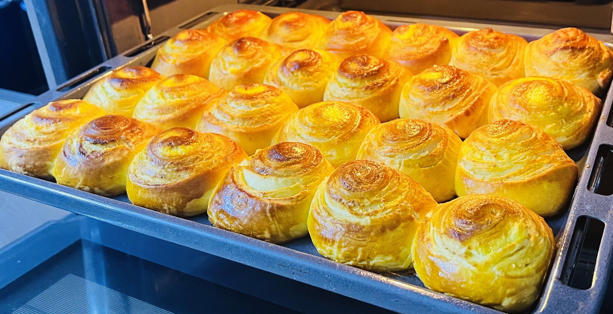 3. Когда тесто увеличится в объёме, разделить его на 12 одинаковых частей. Каждую часть скатать в шарик и раскатать в удлиненный пласт. Смазать маслом, завернуть в трубочку, а затем дать каждому изделию немного отдохнуть. После, снова раскатать и распределить начинку, завернуть в рулет.