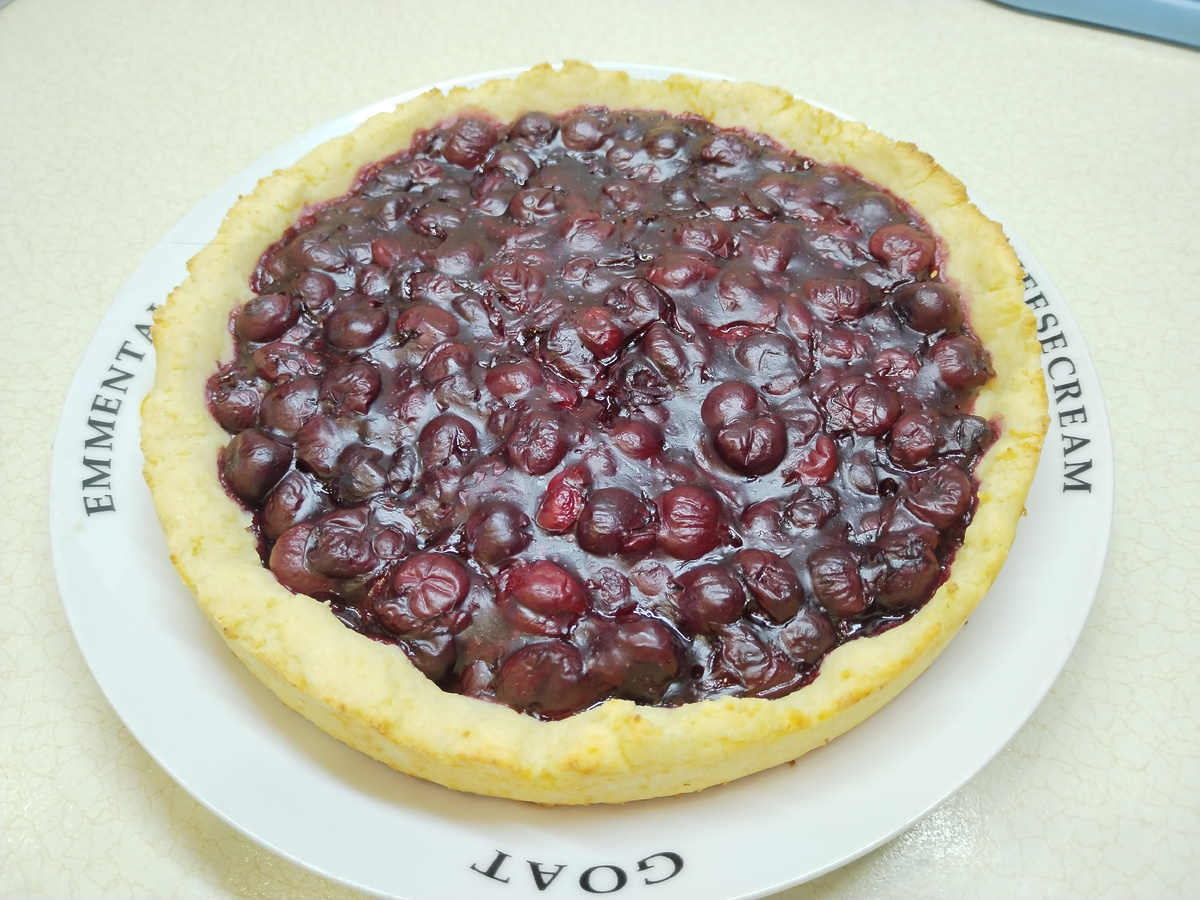 Когда основа готова, на нее выкладывается сладкая вишневая начинка. Десерт запекается еще 15-20 минут при той же температуре. После завершения выпечки ватрушку следует остудить, прежде чем нарезать и подавать к столу.