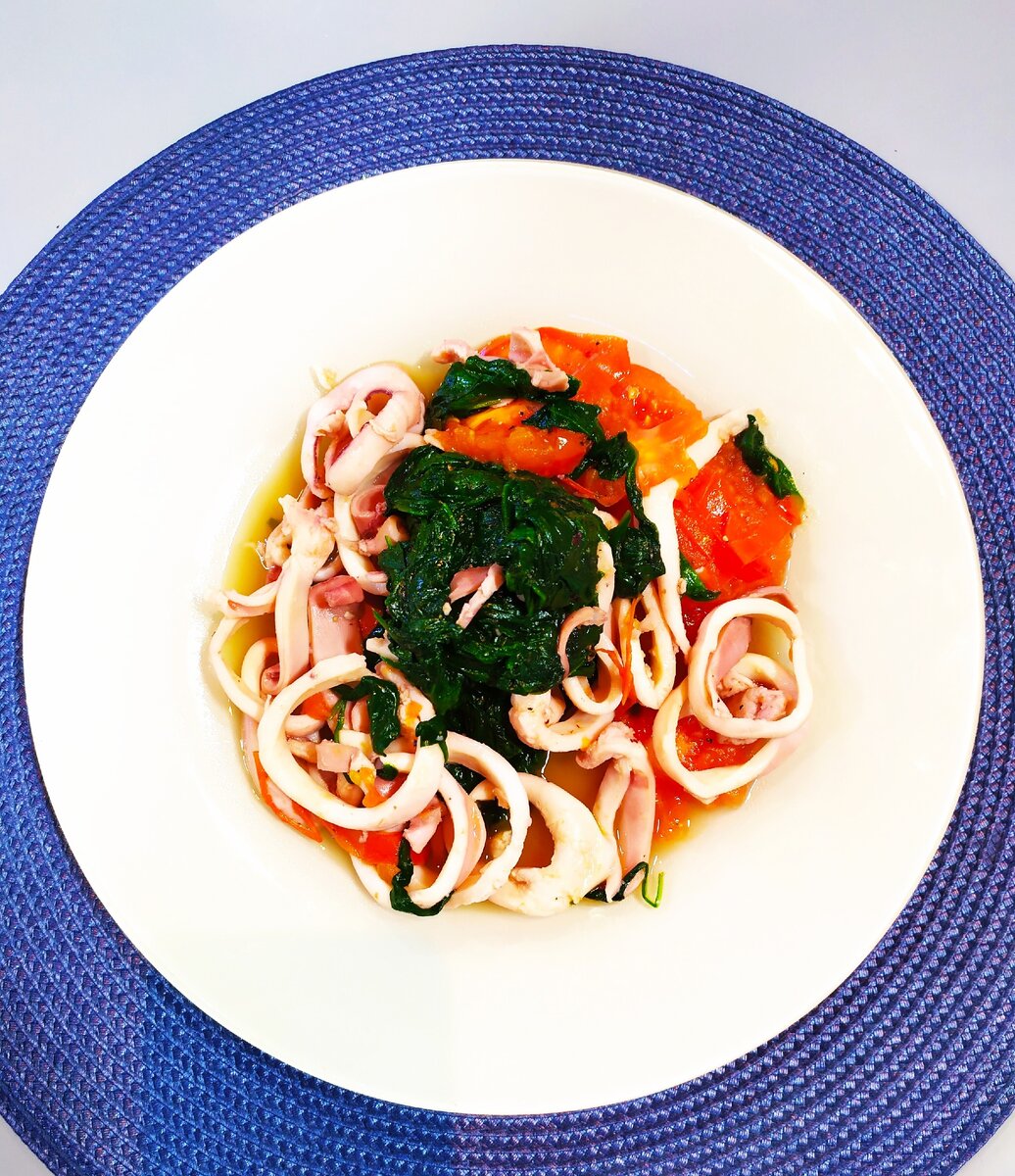 1. Начните с подготовки кальмаров. Залейте сырьё кипятком и оставьте на три минуты. После этого очистите их, промойте и нарежьте кольцами.