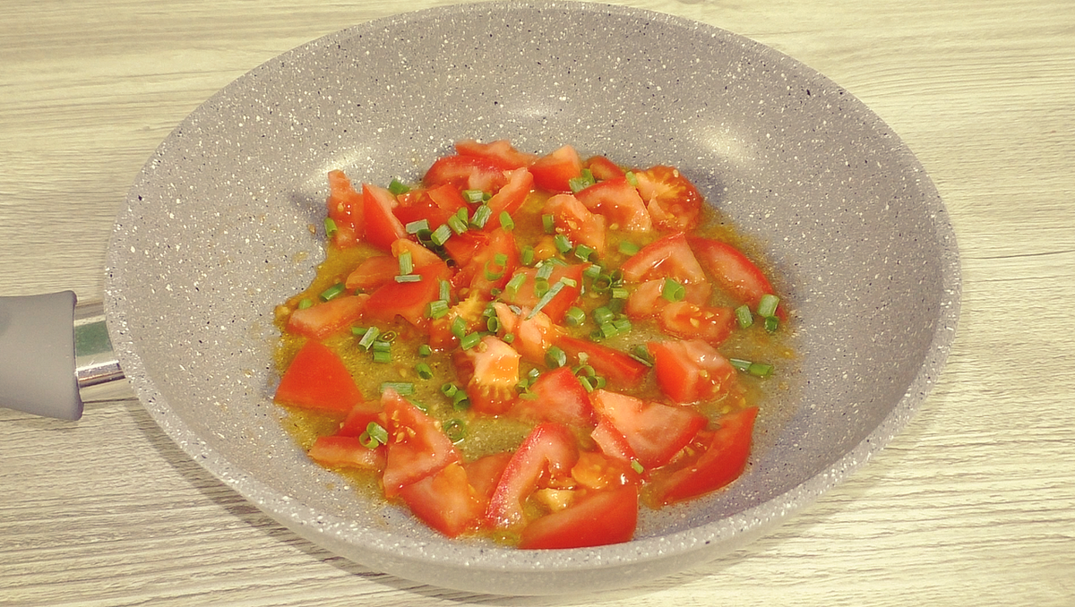 На сковороду с небольшим количеством растительного масла положите нарезанный помидор и зелёный лук. Притушите немного, посолите и добавьте специи; можно добавить чуть сахара для балансировки кислоты помидора.