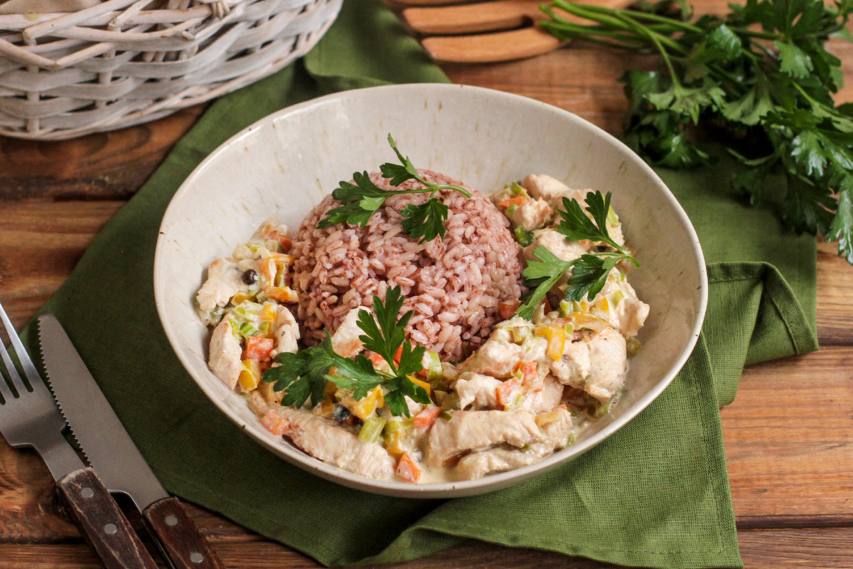 Шаг 2: К овощам добавить лук-порей и чеснок. Готовить 1-2 минуты. Затем выложить кусочки индейки, посолить и поперчить. Перемешать и жарить 3-4 минуты. Влить сливки и куриный бульон, снова посолить и прогреть все вместе 2-3 минуты. Удалить лавровый лист и душистый перец. Подавайте индейку с овощами в сливочном соусе с гарниром из риса.