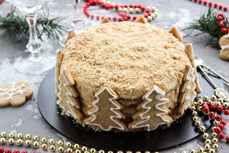 Дополнительно торт можно украсить орехами или дополнительным черносливом. На новогодние праздники он прекрасно будет смотреться с имбирными пряниками на украшение.