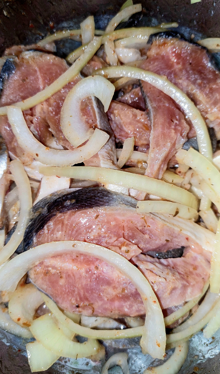 Для усиления вкуса к рыбе добавьте соль и немного сахара. Знали ли вы, что добавление сахара делает мясо рыбы более упругим? На следующий день к маринаду можно добавить лук — нарезайте его кольцами или полукольцами по вкусу.