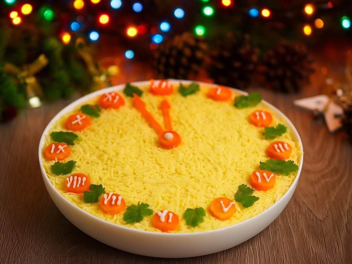 Салат «Часы» — это не просто еда, а настоящая шедевр к праздничному столу! Он не только вкусный и сытный, но и выглядит очень эффектно, символизируя последние мгновения уходящего года и ожидание нового счастья.