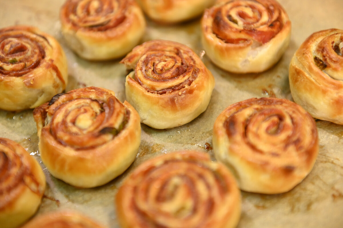 Начать стоит с подготовки колбасы: её нужно нарезать очень тонкими кружочками или овалами. Так рулетики будут выглядеть аккуратно и аппетитно.Далее на стол желательно положить пленку или просто посыпать его мукой и раскатать слоеное тесто в прямоугольный пласт. Это придаст рулетикам идеальную форму.На развернутое тесто равномерно выкладываются кусочки колбасы, причем их можно укладывать внахлест, чтобы каждая порция была насыщенной.После этого следует нарезать зеленый лук и посыпать им подготовленную колбасу. Лук добавит свежести и аромата.Настало время формировать рулет: нужно аккуратно закручивать тесто с начинкой, начиная с одного края. Чем туже получится закрутить, тем красивее и аккуратнее будут готовые рулетики.Рулет следует нарезать на несколько кружочков и выложить их на противень, предварительно застеленный пергаментом для выпечки.Чтобы рулетики выглядели более аппетитно, их стоит смазать смесью из яйца с небольшим количеством воды или молока. Это придаст им красивую золотистую корочку.Выпекать рулетики нужно в заранее разогретой до 180 градусов духовке в течение 10-15 минут. Как только они станут золотистыми, можно смело подавать на стол!Эти восхитительные слоеные рулетики с колбасками — идеальное решение для любой вечеринки или семейного ужина. Простота приготовления и отличный вкус сделают их любимым лакомством для всех!