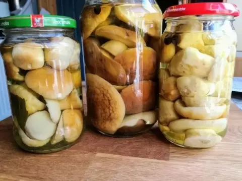 Готовые грибы нужно расфасовать по стерилизованным банкам, не плотно укладывая. Залейте их горячим маринадом, приготовленным из перечисленных ингредиентов.