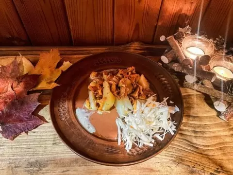 Когда картофель начинает готовиться (это можно проверить с помощью вилки), его извлекают из духовки и аккуратно размещают сверху размороженные грибы. На данном этапе важно учитывать, что лисички уже отварные, и не стоит их слишком долго держать в духовке, чтобы не пересушить.