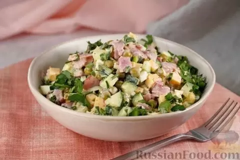 - Салат с ветчиной, огурцами и горошком: Это блюдо идеально подходит как для быстрого перекуса, так и для подачи на праздничный стол. Сочетание вареных яиц и ветчины в гармонии с хрустящими огурцами и сладким зеленым горошком придаст салату свежесть. А сливочный сыр позволит подчеркнуть все вкусовые нотки.