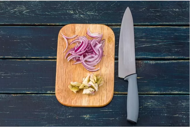 Шаг 1: Для начала разогревают духовку до 180°C. Артишоки нарезаются небольшими кусочками, а половина красного лука – тонкими дольками. При желании, нарезать можно весь лук.