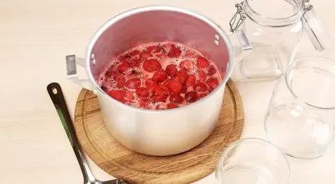 Для классического рецепта требуется соотношение ягод и сахара 1:1. В большую кастрюлю наливается вода слоем около 1 см, затем аккуратно посыпается сахаром, после чего добавляются ягоды или нарезанные фрукты. Ставить на огонь следует аккуратно, не мешая, а только слегка покачивая кастрюлю. Как только варенье закипит, наступает время действовать: нужно варить на сильном огне, постоянно помешивая и снимая пену, в течение ровно 5 минут. Готовое варенье раскладывается по стерилизованным банкам, плотно закрывается и переворачивается для охлаждения.