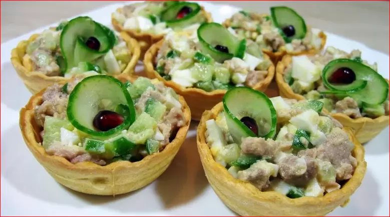Для декора подойдут свежая зелень и нарезанные ломтики огурца. Готовится всё очень просто: нарезать яйца и печень кубиками, мелко порезать огурец и лук, соединить все ингредиенты с майонезом, аккуратно перемешать и наполнить тарталетки. Остаётся только украсить, и закуска готова!