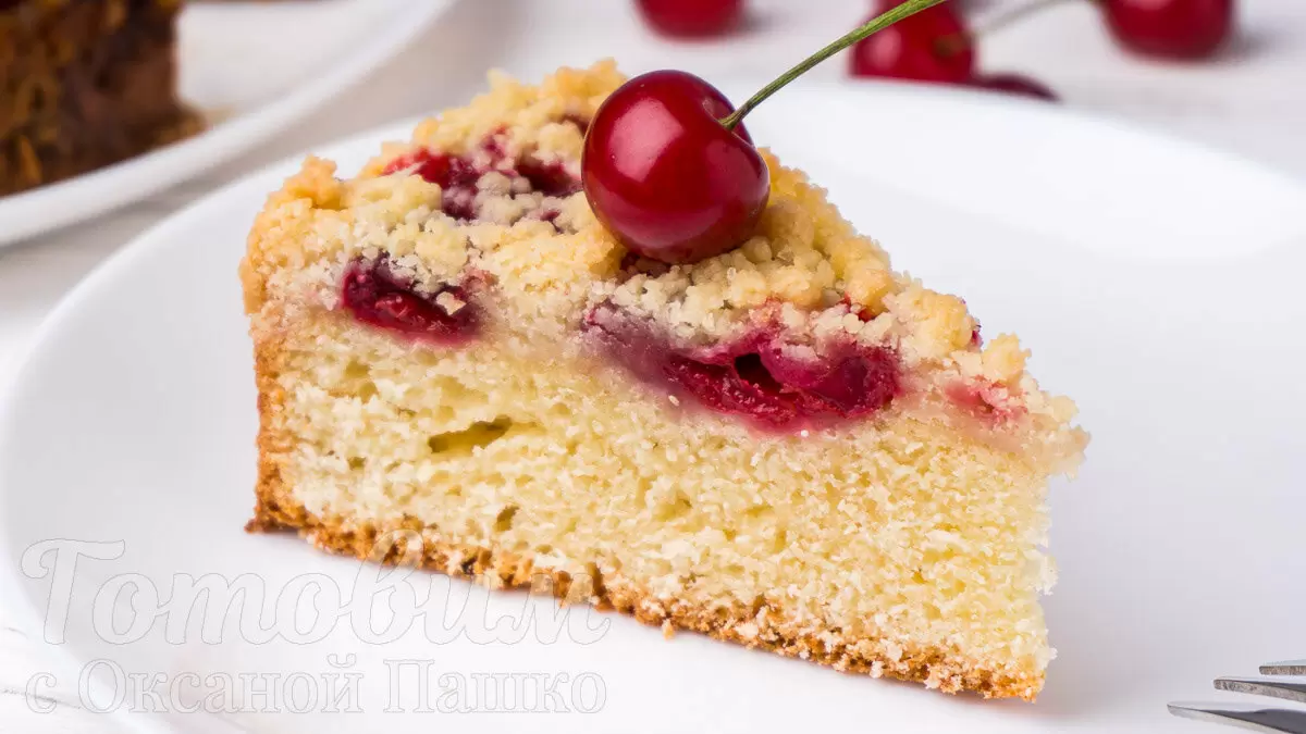 Этот пирог качует между сладостью бисквита, кислинкой вишни и хрустящей шапочкой из штрейзеля.