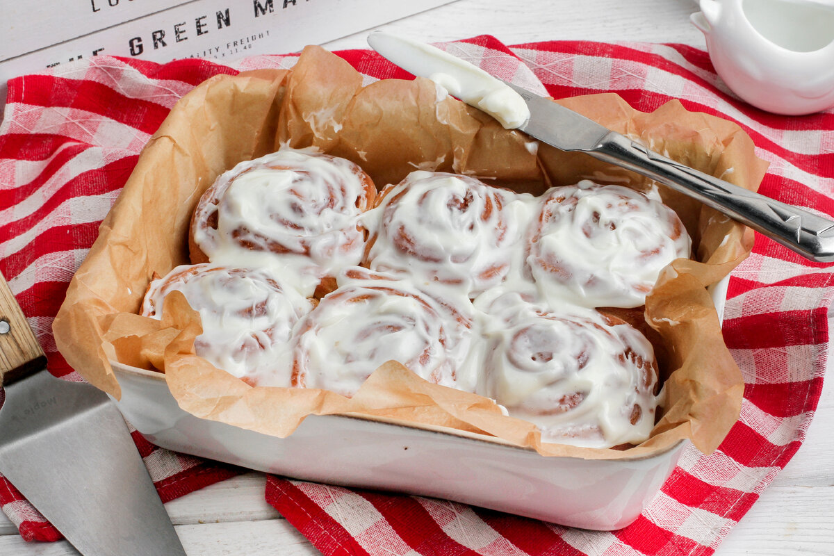 Приготовить крем, взбивая в глубокой миске творожный сыр, молоко и сахарную пудру до однородной массы. Нанести крем на горячие булочки и подавать к столу, наслаждаясь ароматом и вкусом!
